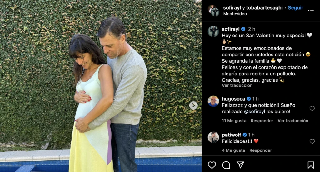 Las fotos obtuvieron, rápidamente, miles de likes y felicitaciones departe de sus seguidores y colegas amigos. Adriana Da Silva, Camila Rajchman, Pati Wolf. Giannina Silva, Lucía Brocal, Victoria Rodríguez, Cata Ferrand, Hugo Soca, Magui Prado, entre otros, fueron algunos de sus compañeros de trabajo en el medio uruguayo que se mostraron felices con la noticia de Sofía y Tomás.
