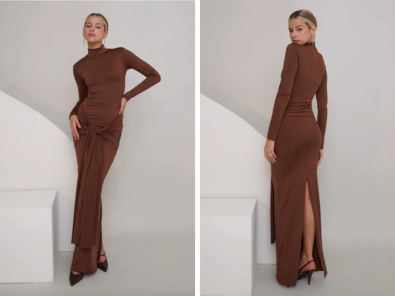 Mientras que en la parte trasera cuenta con un tajo profundo en las piernas, para mayor comodidad a la hora de caminar. A su vez, como parte del estilismo, el vestido también puede combinarse con una capucha a tono, accesorio tendencia en Primavera/Verano 23-24.